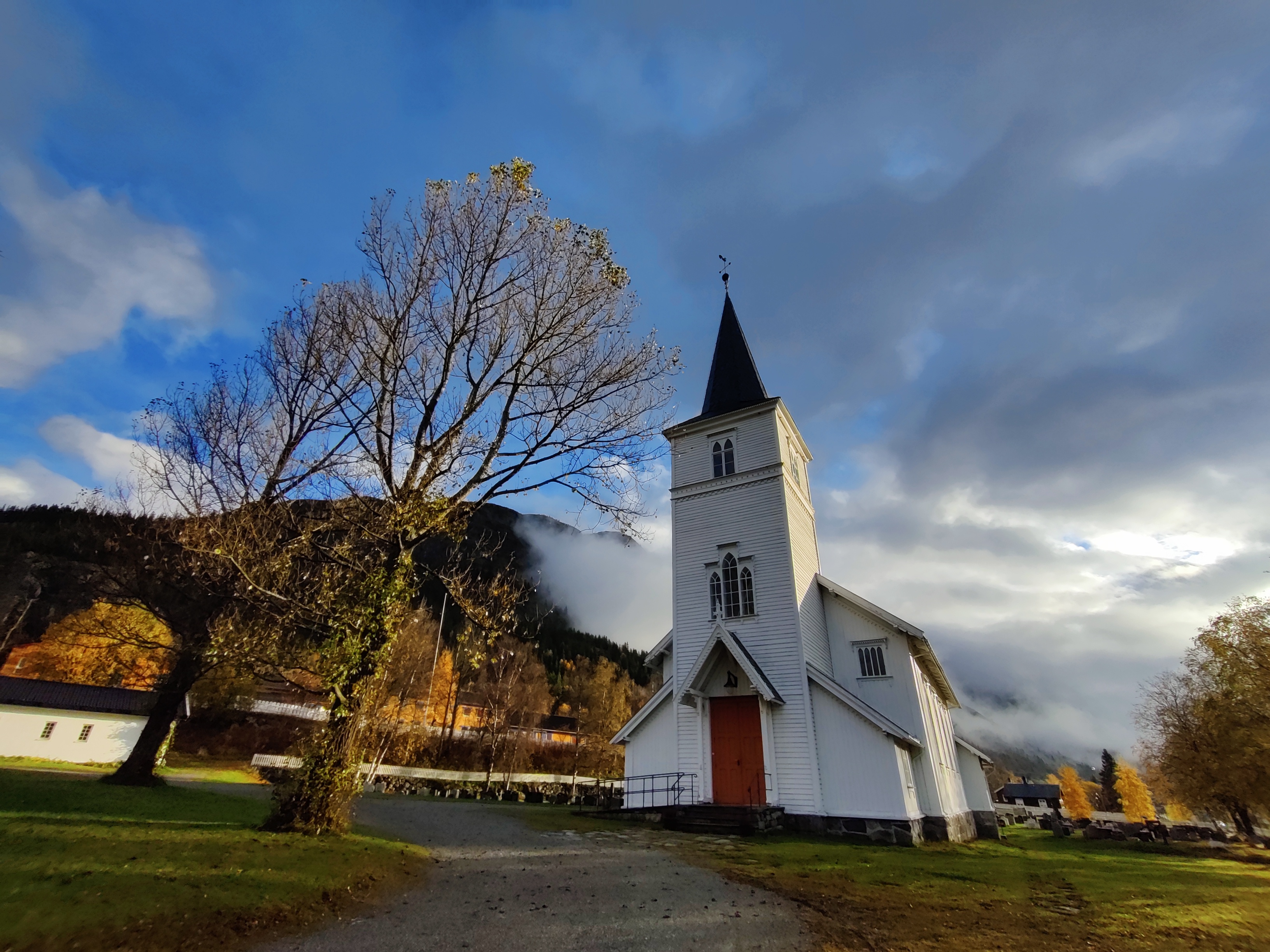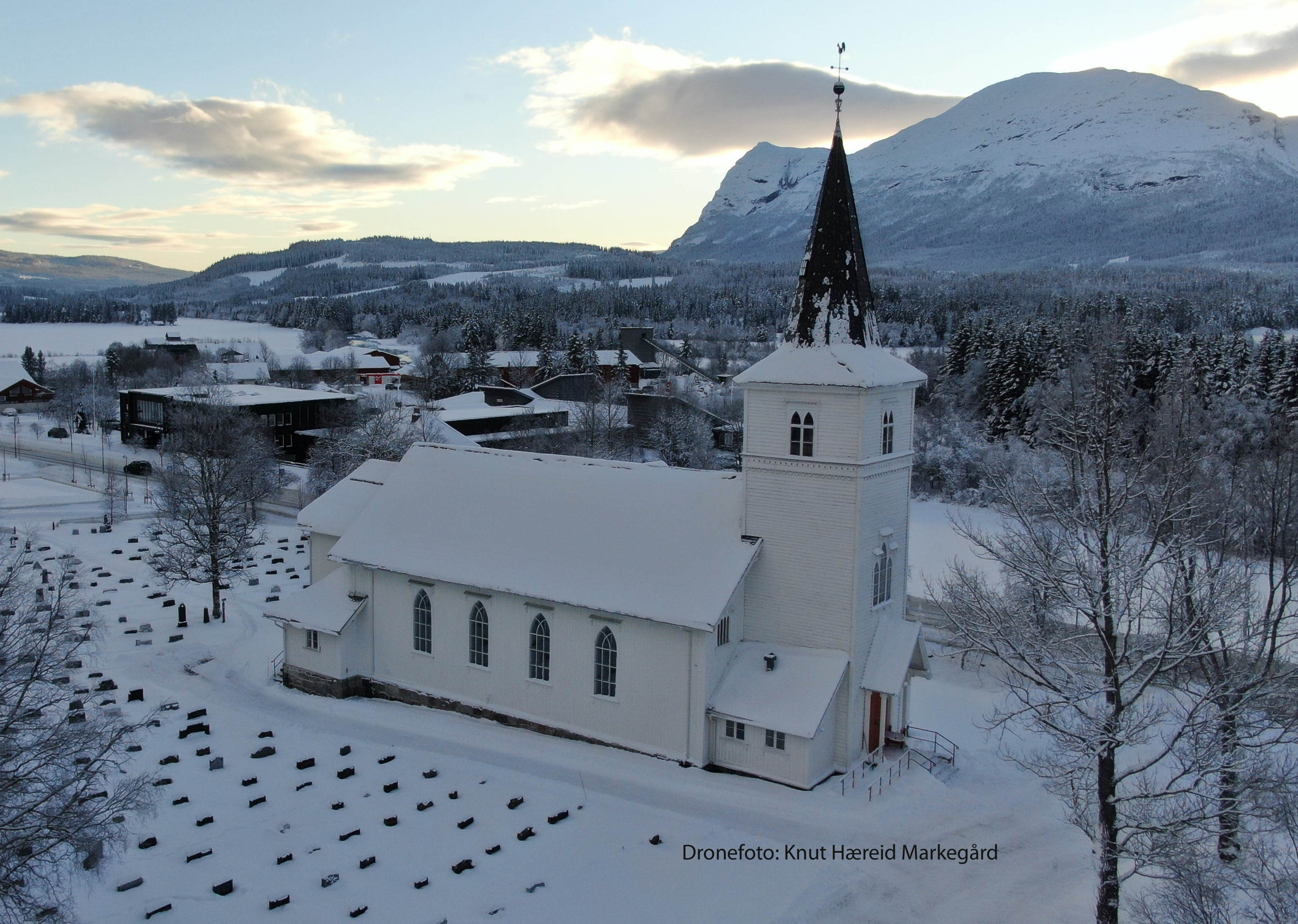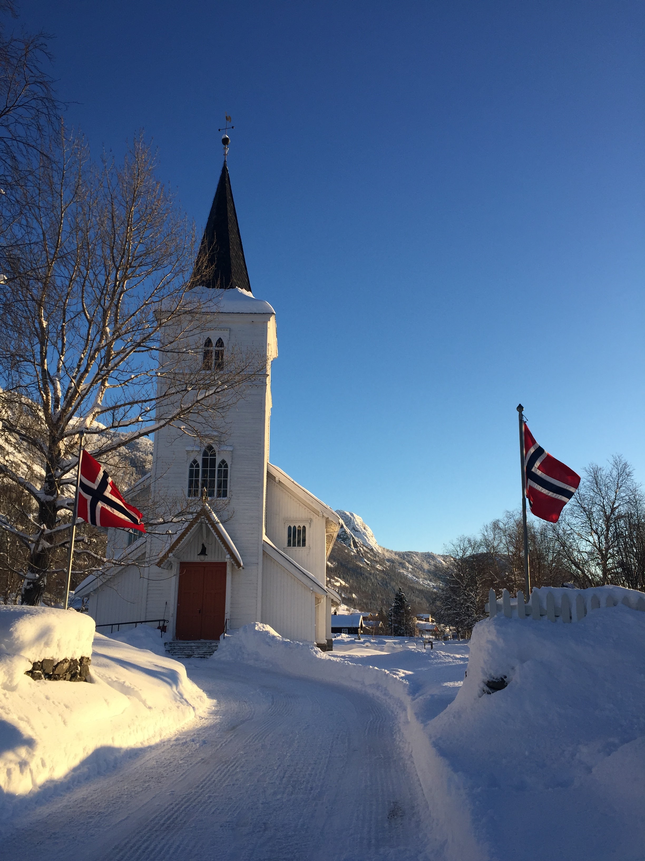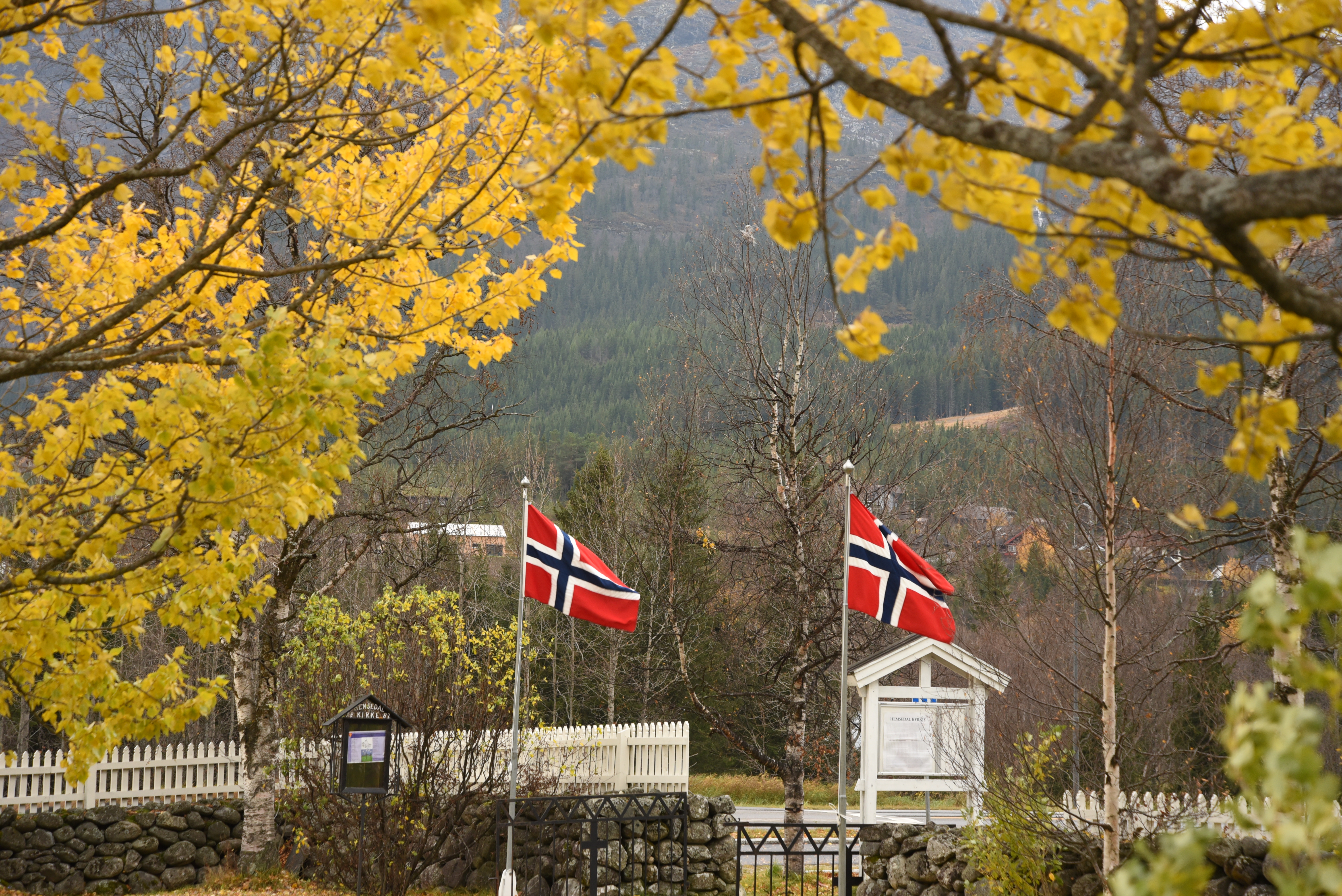 Hemsedal kyrkje ligg vakkert til midt i bygda, med utsikt over dalen og fjella rundt.